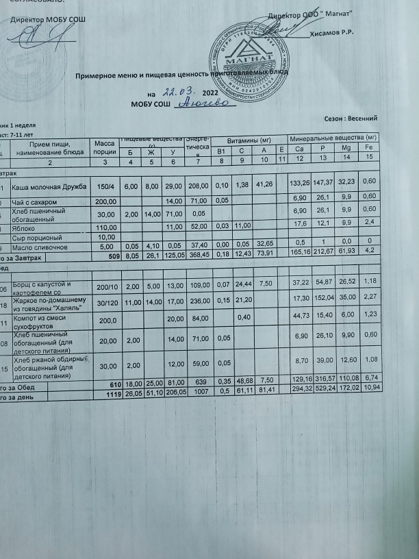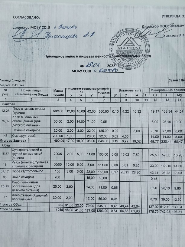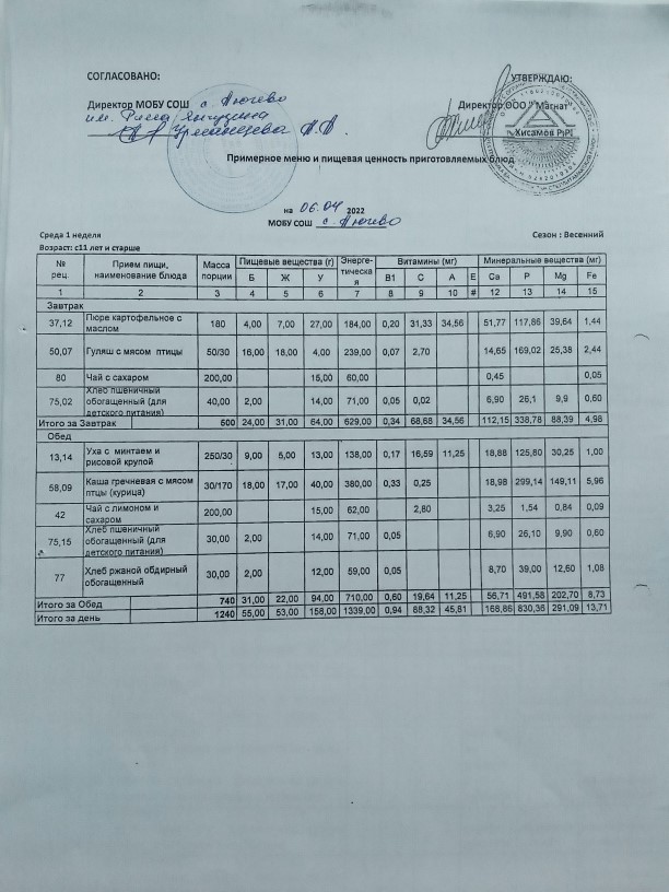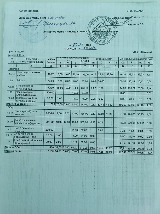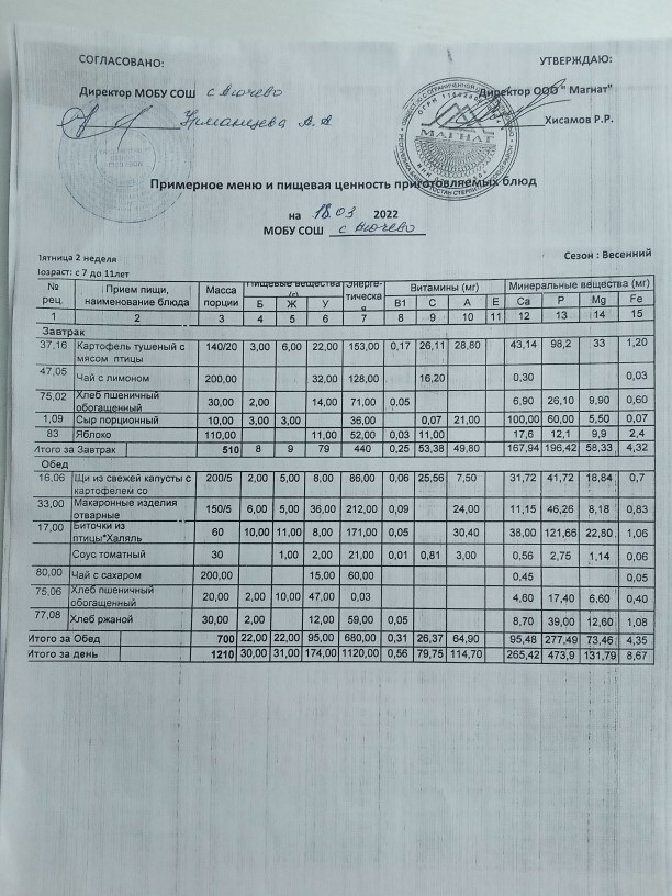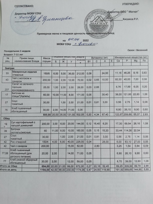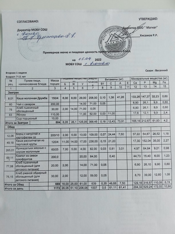 Ежедневное меню дошкольной группы