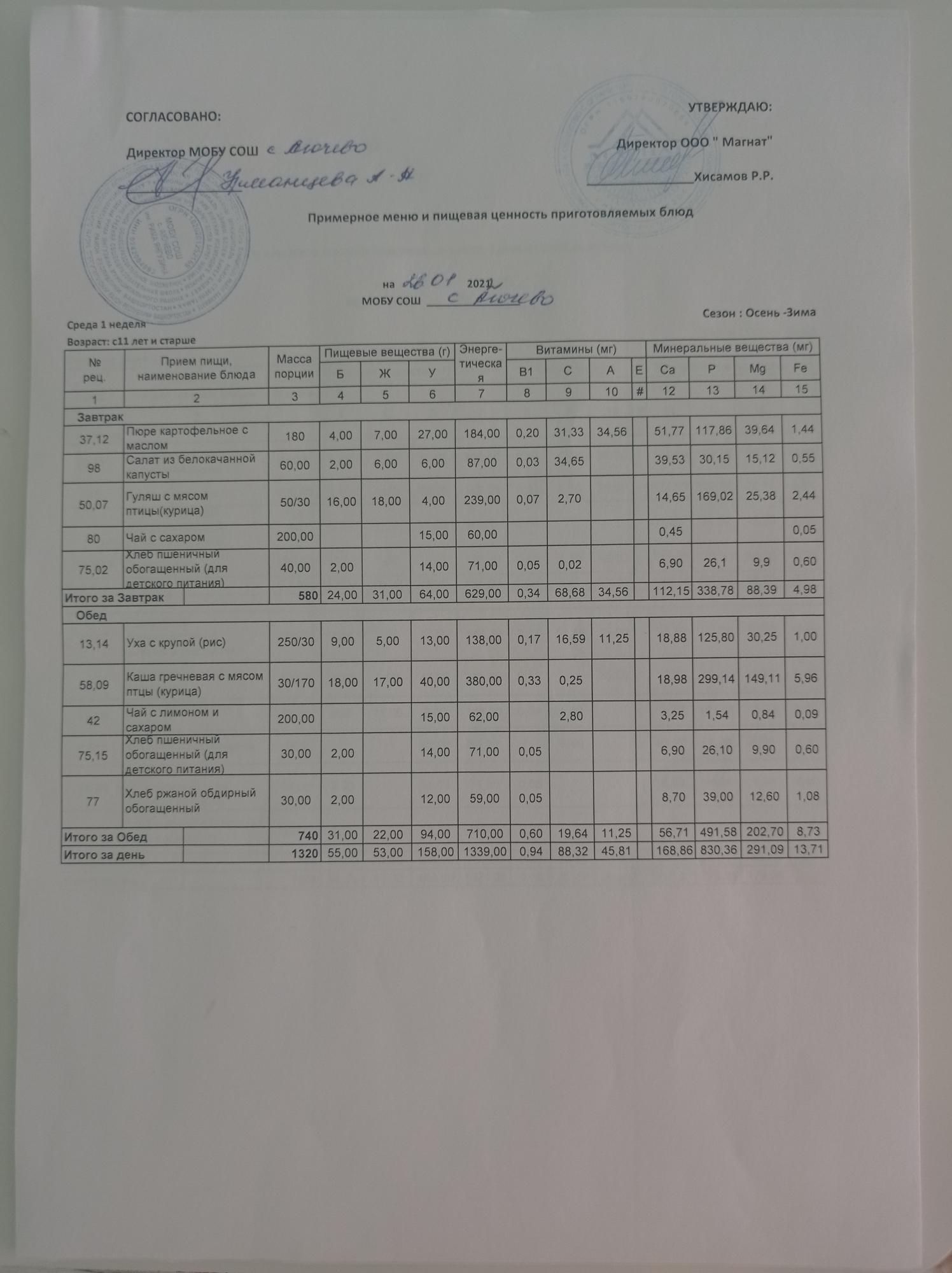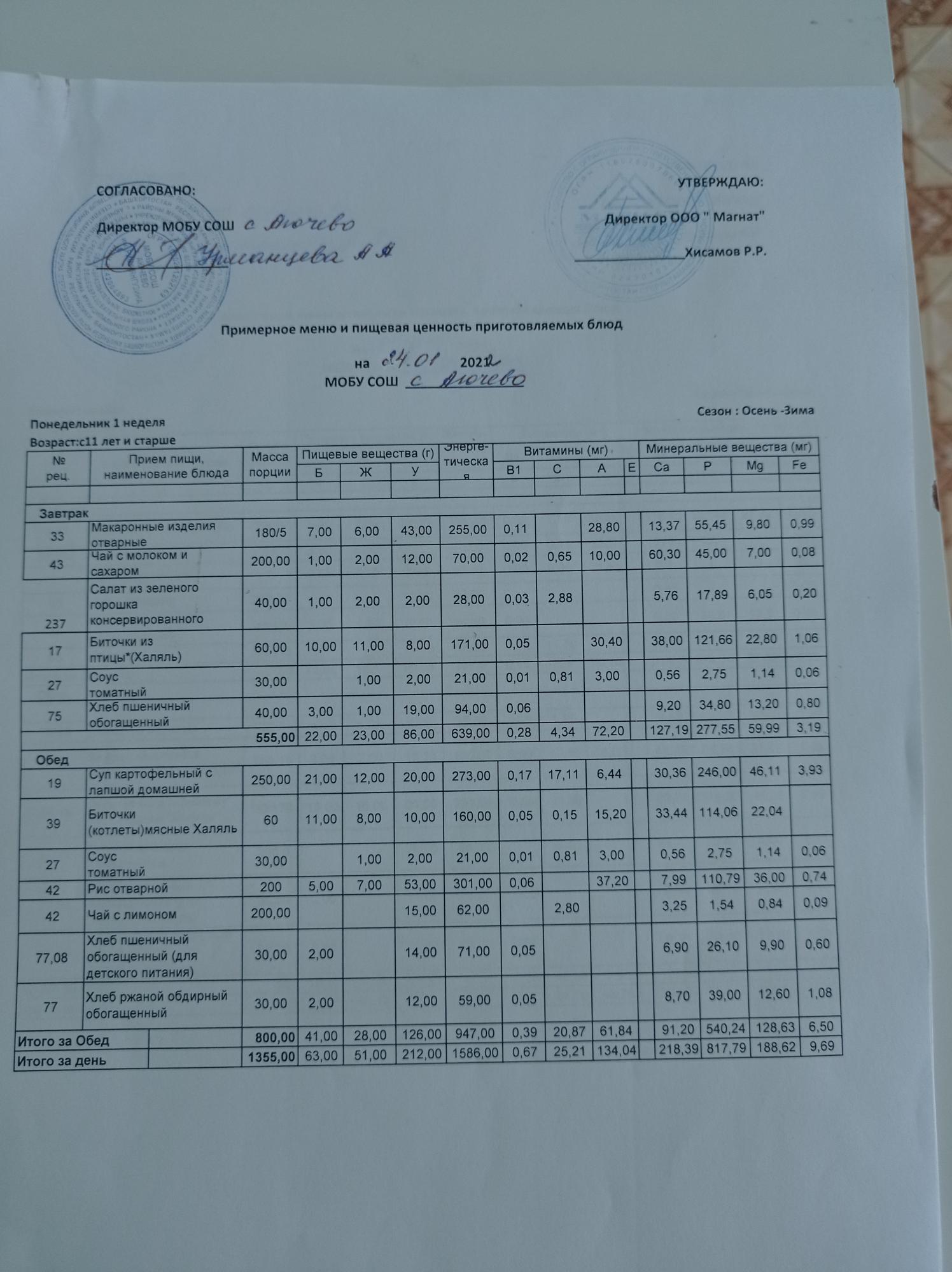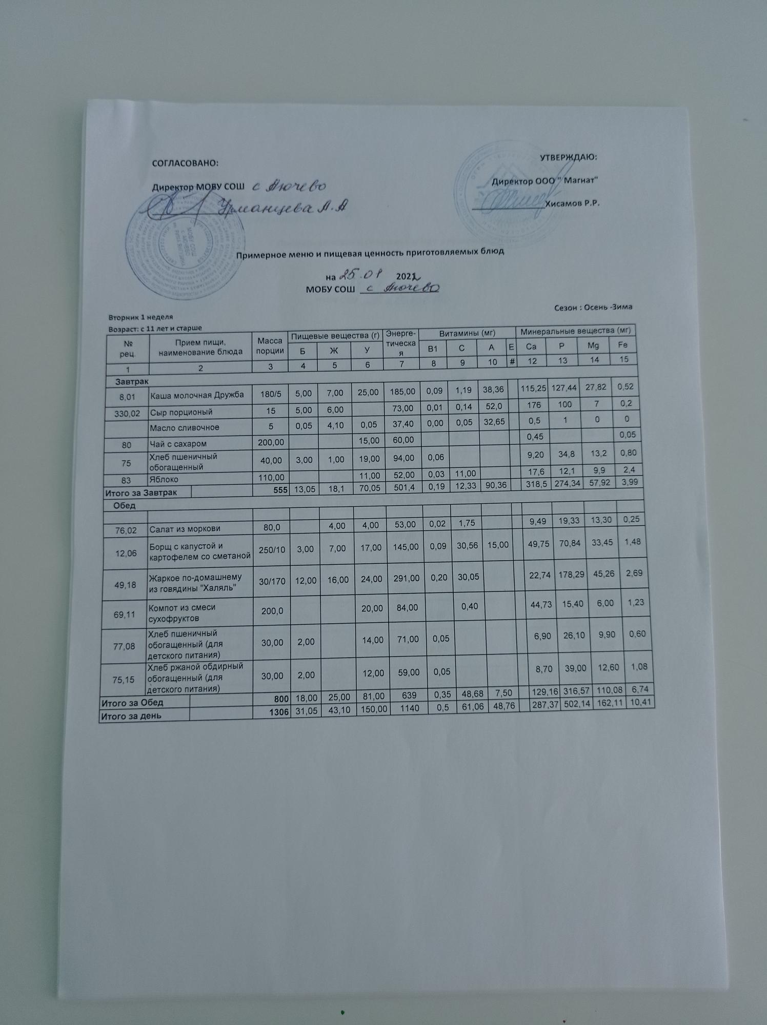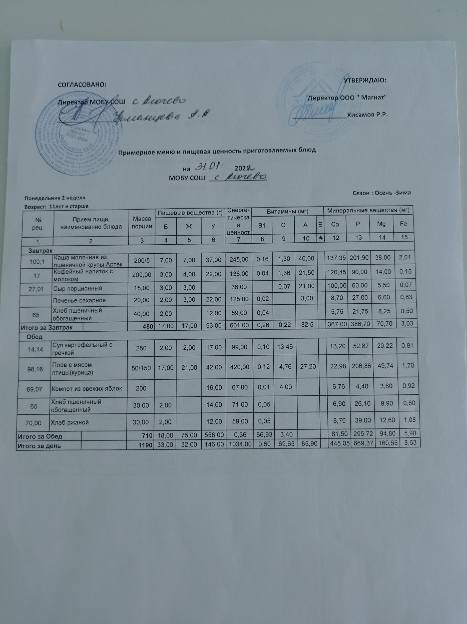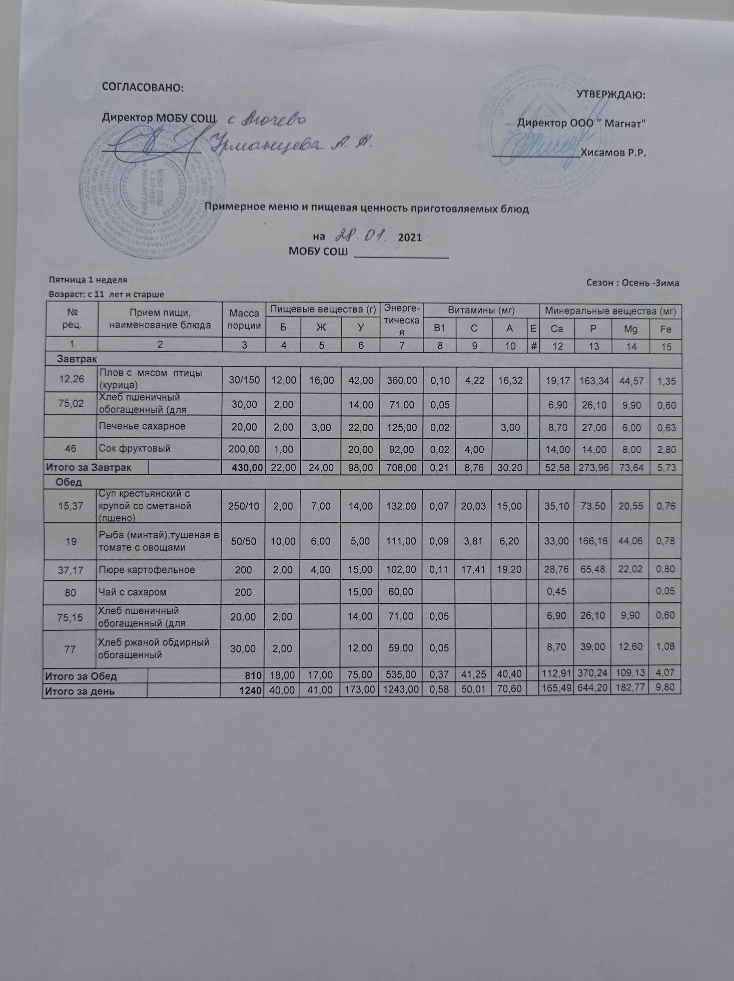Ежедневное меню дошкольной группы