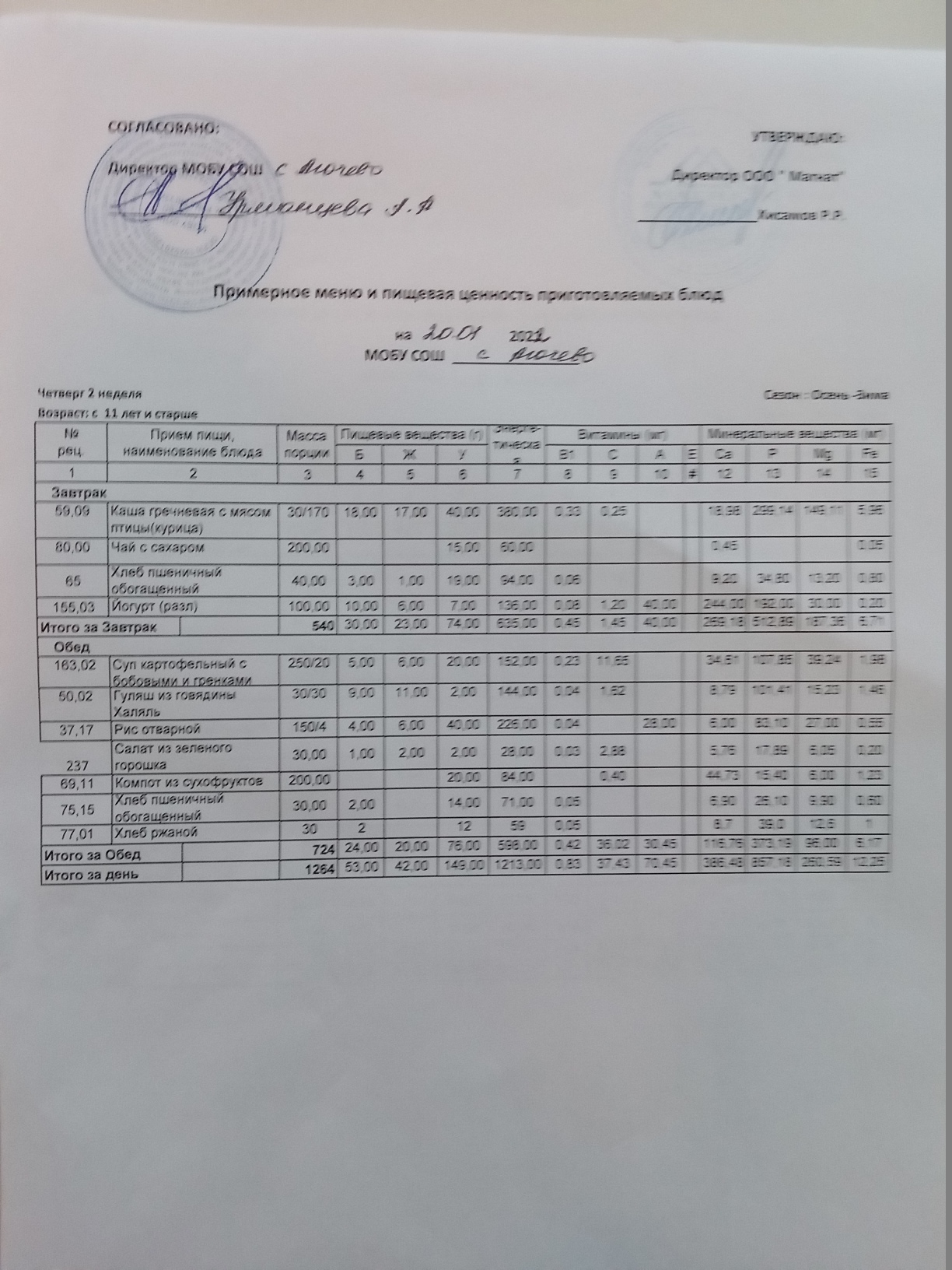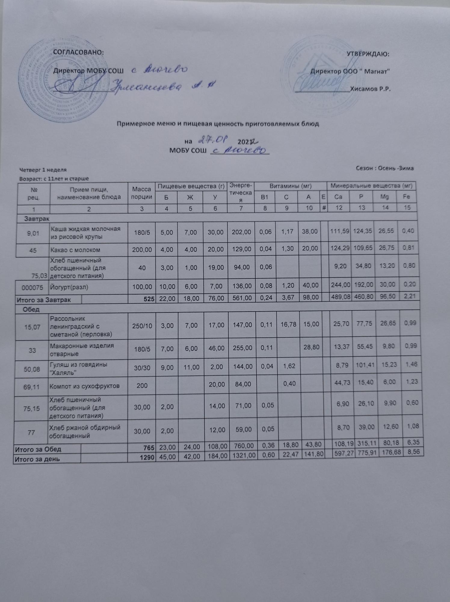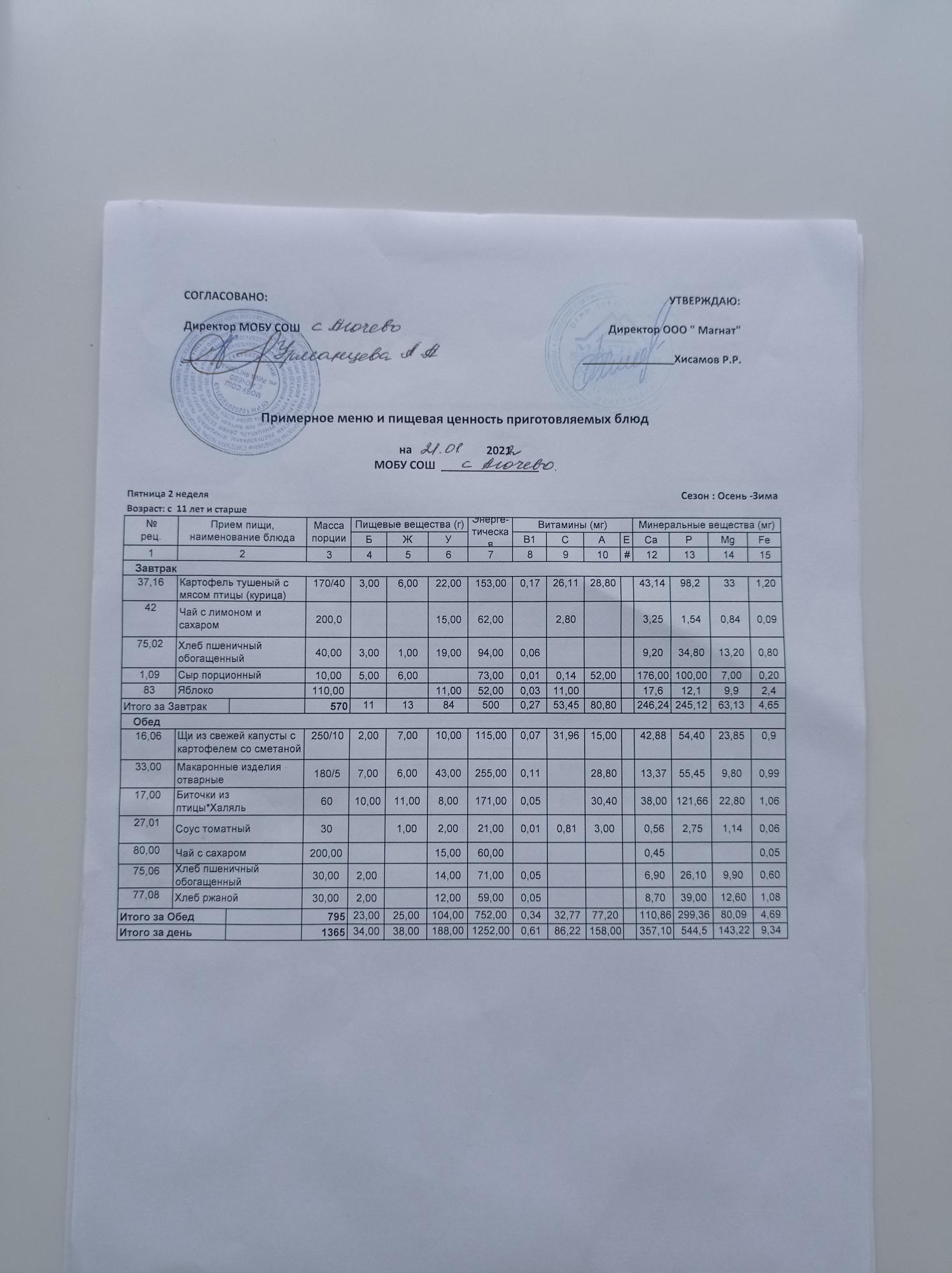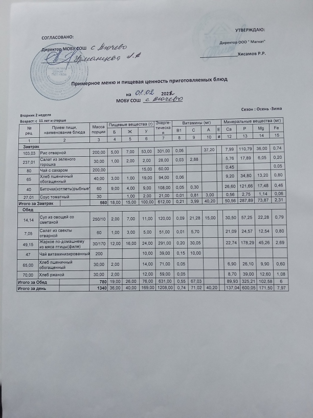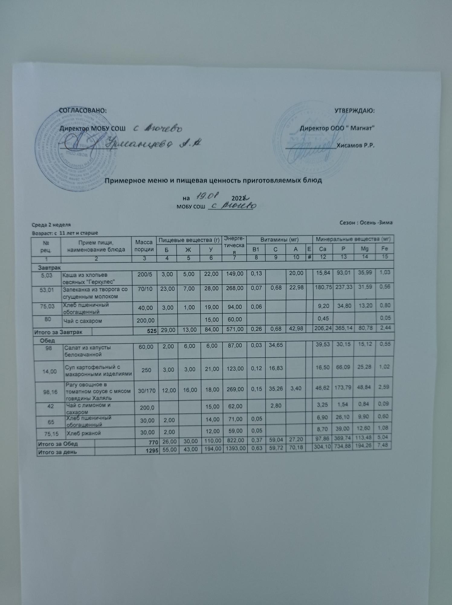 Ежедневное меню дошкольной группы