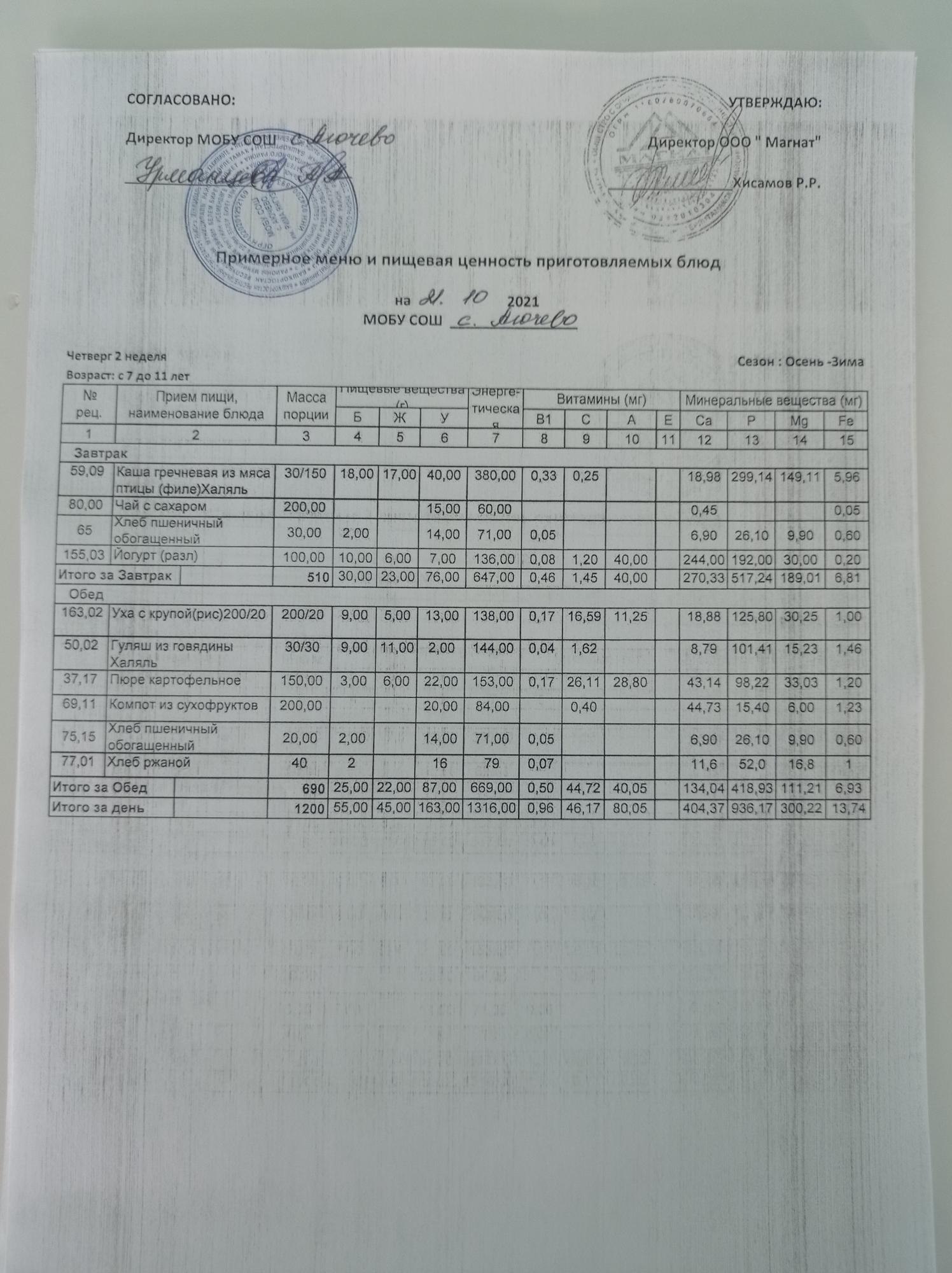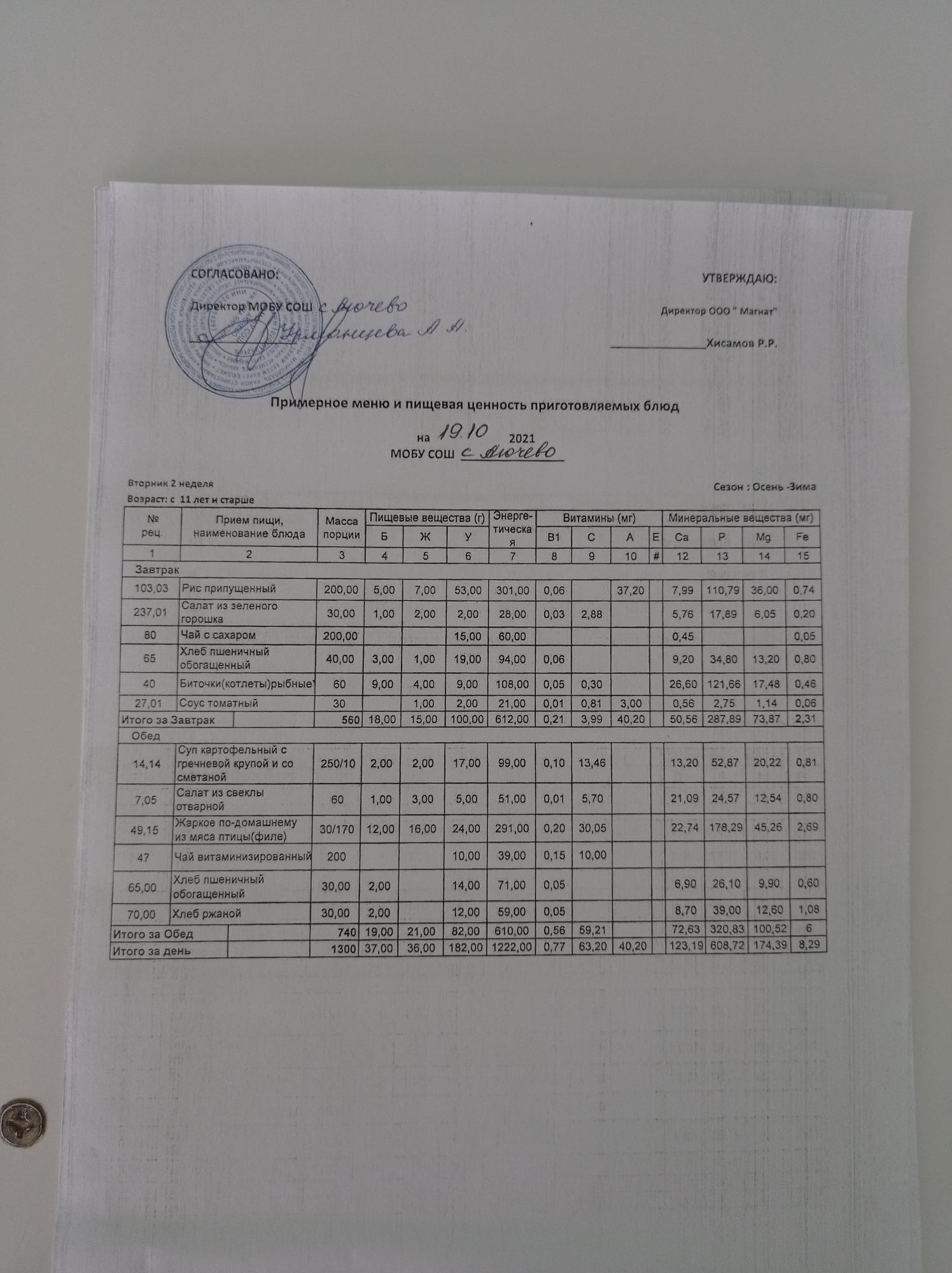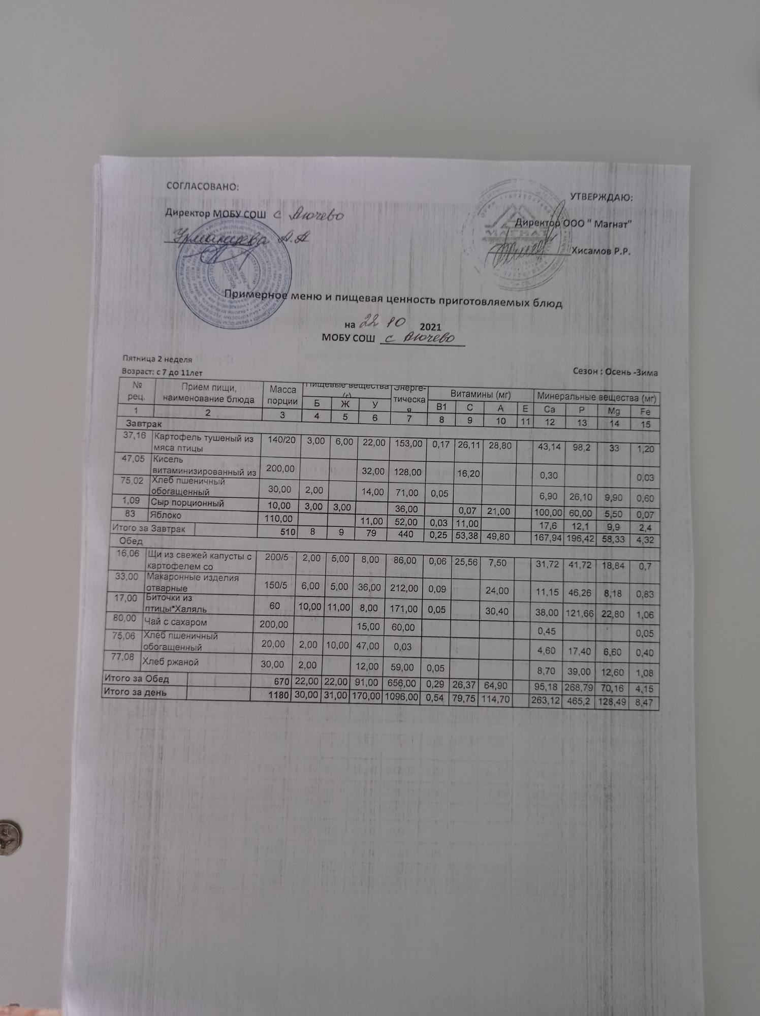 Ежедневное меню дошкольной группы