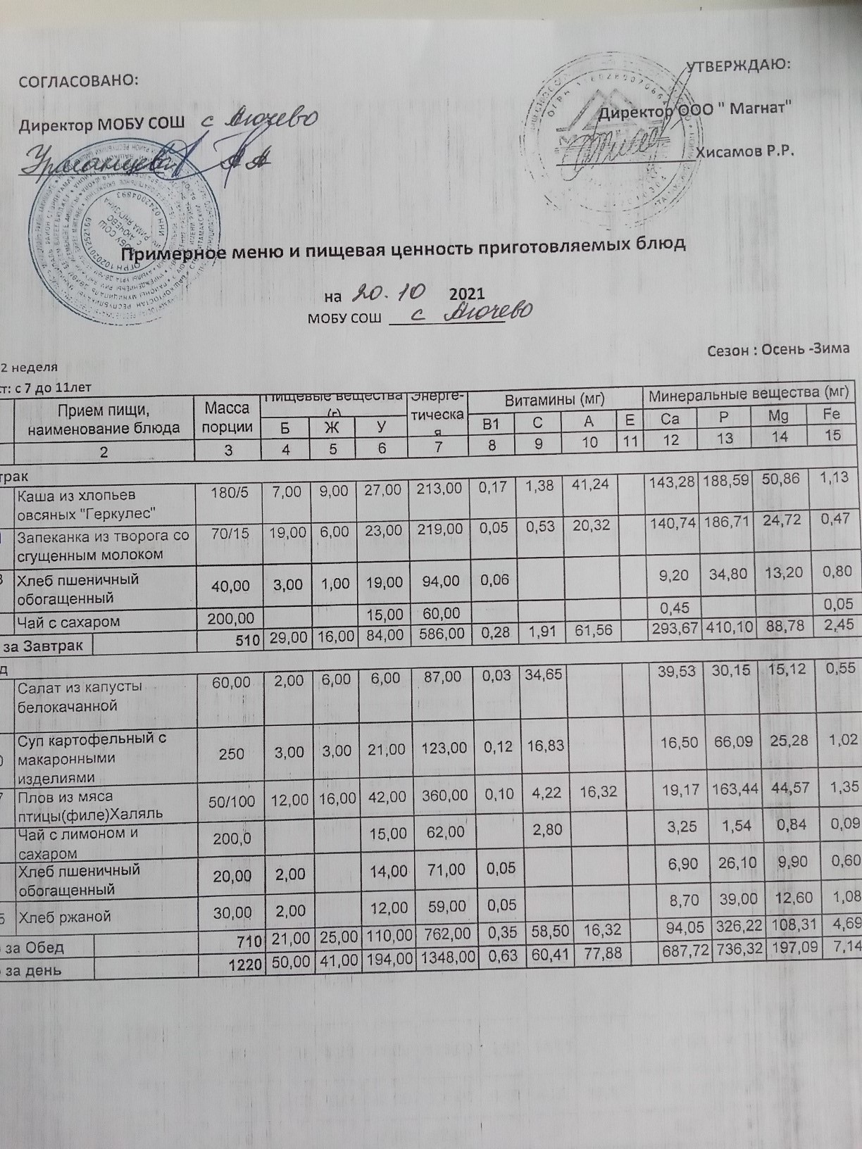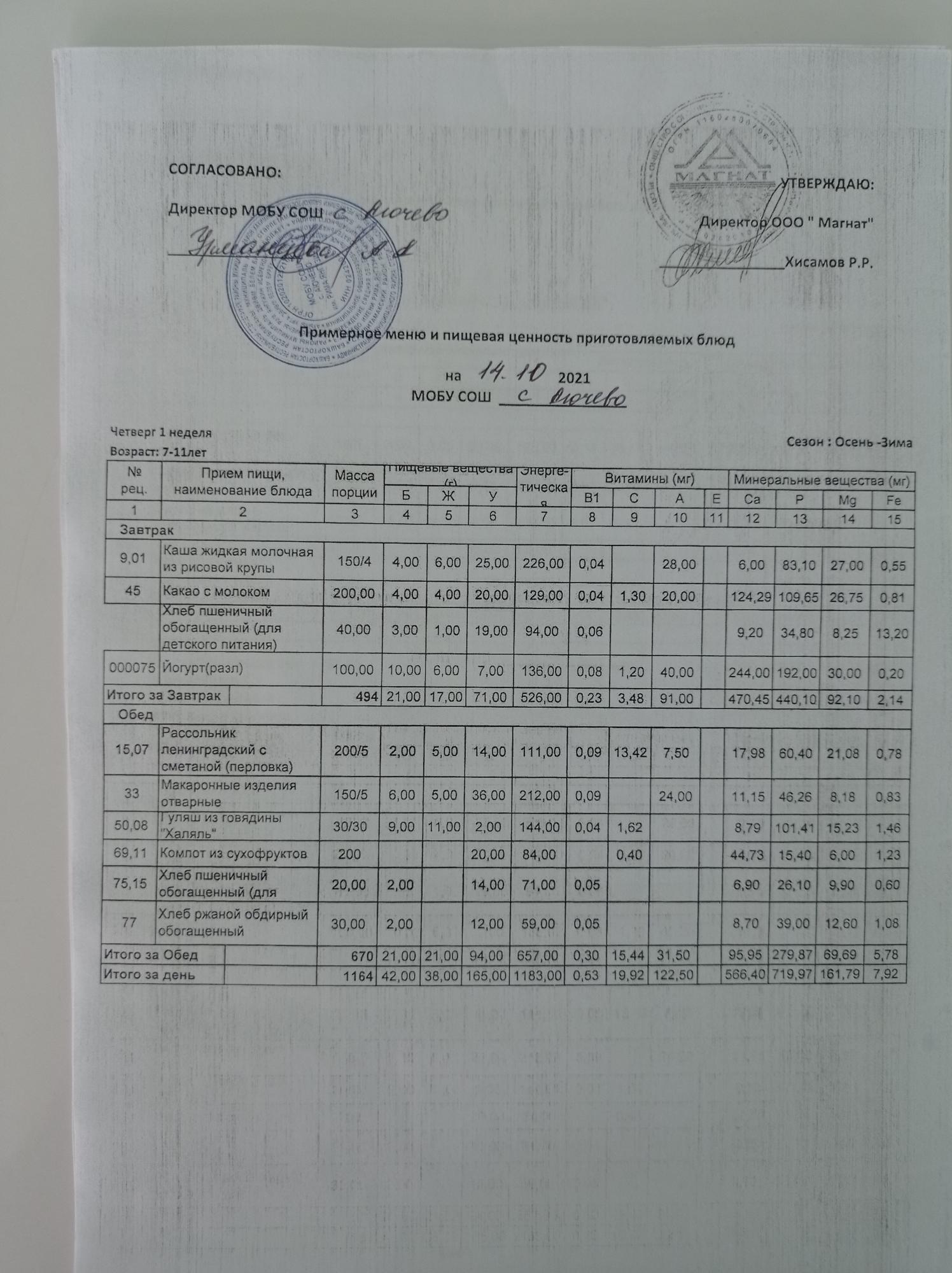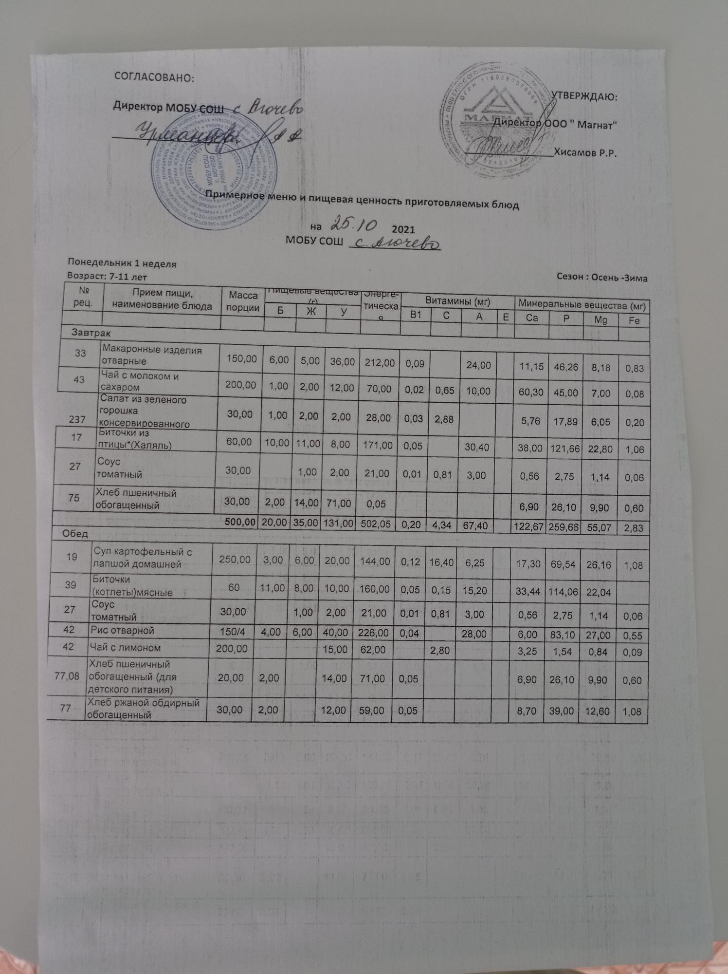 Ежедневное меню дошкольной группы