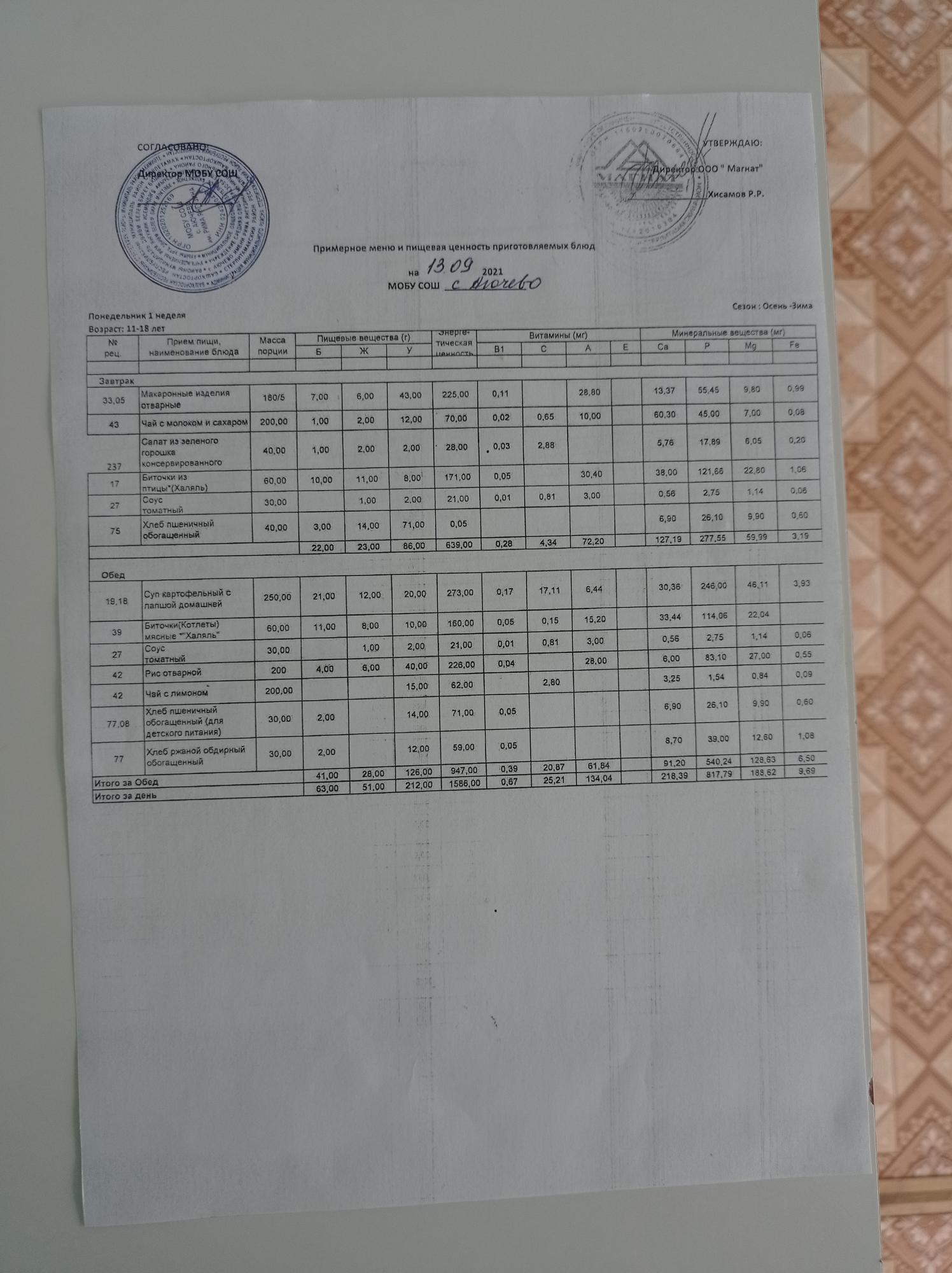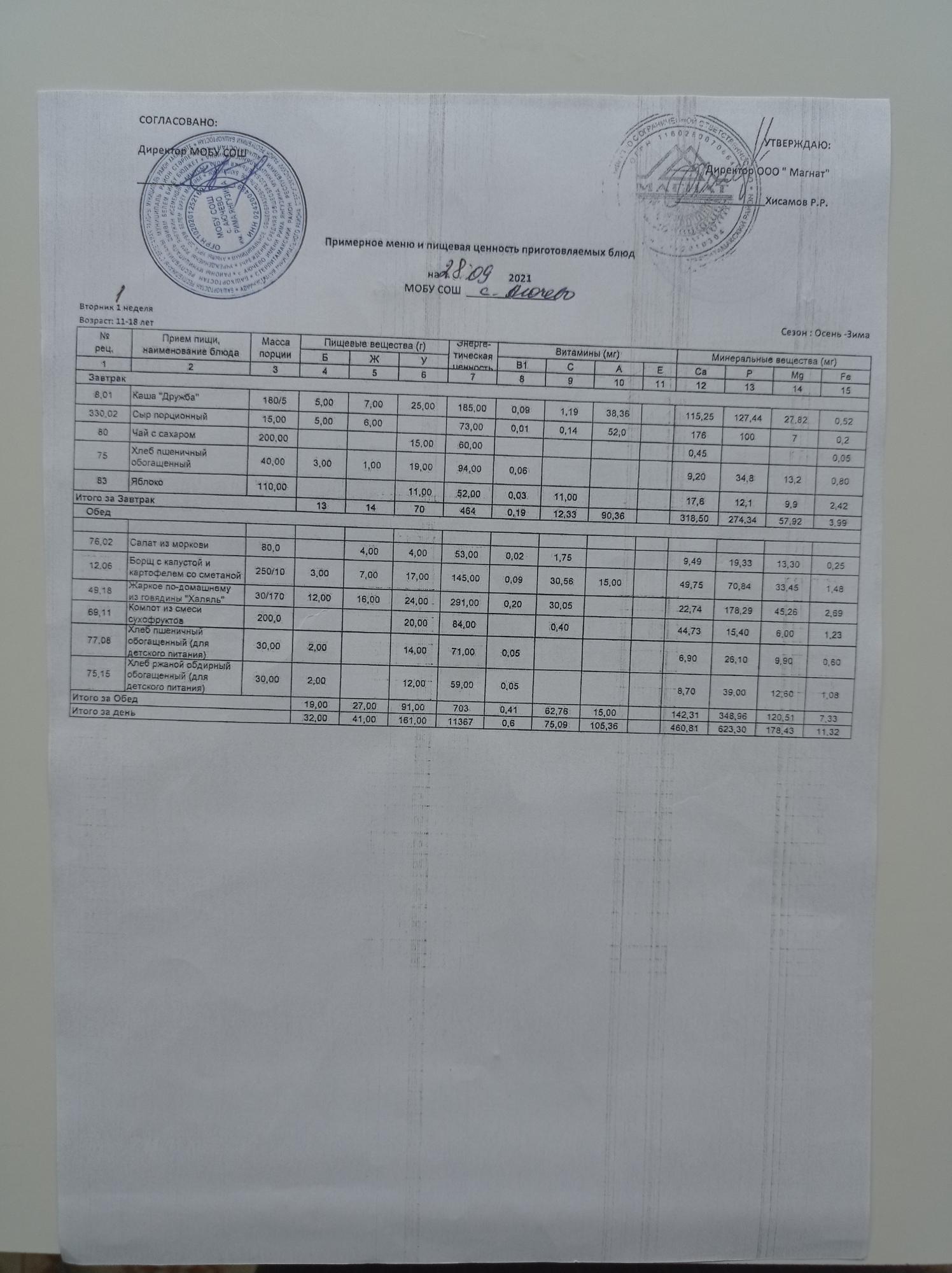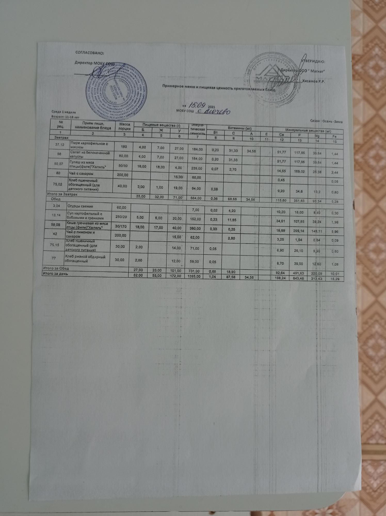 Ежедневное меню дошкольной группы
