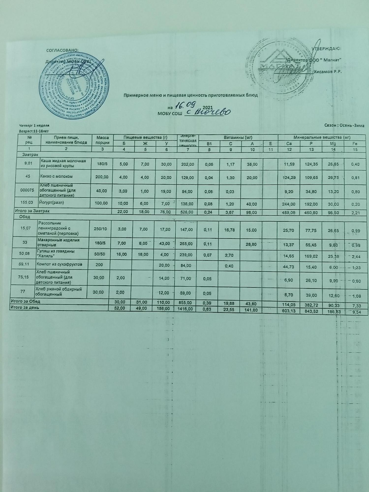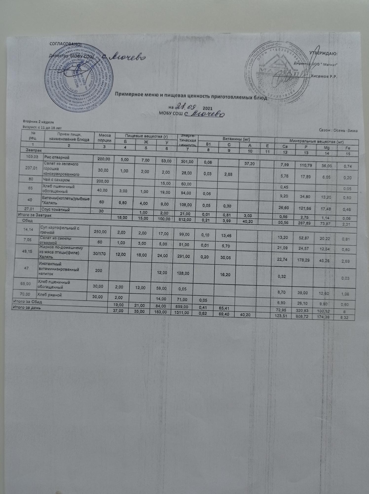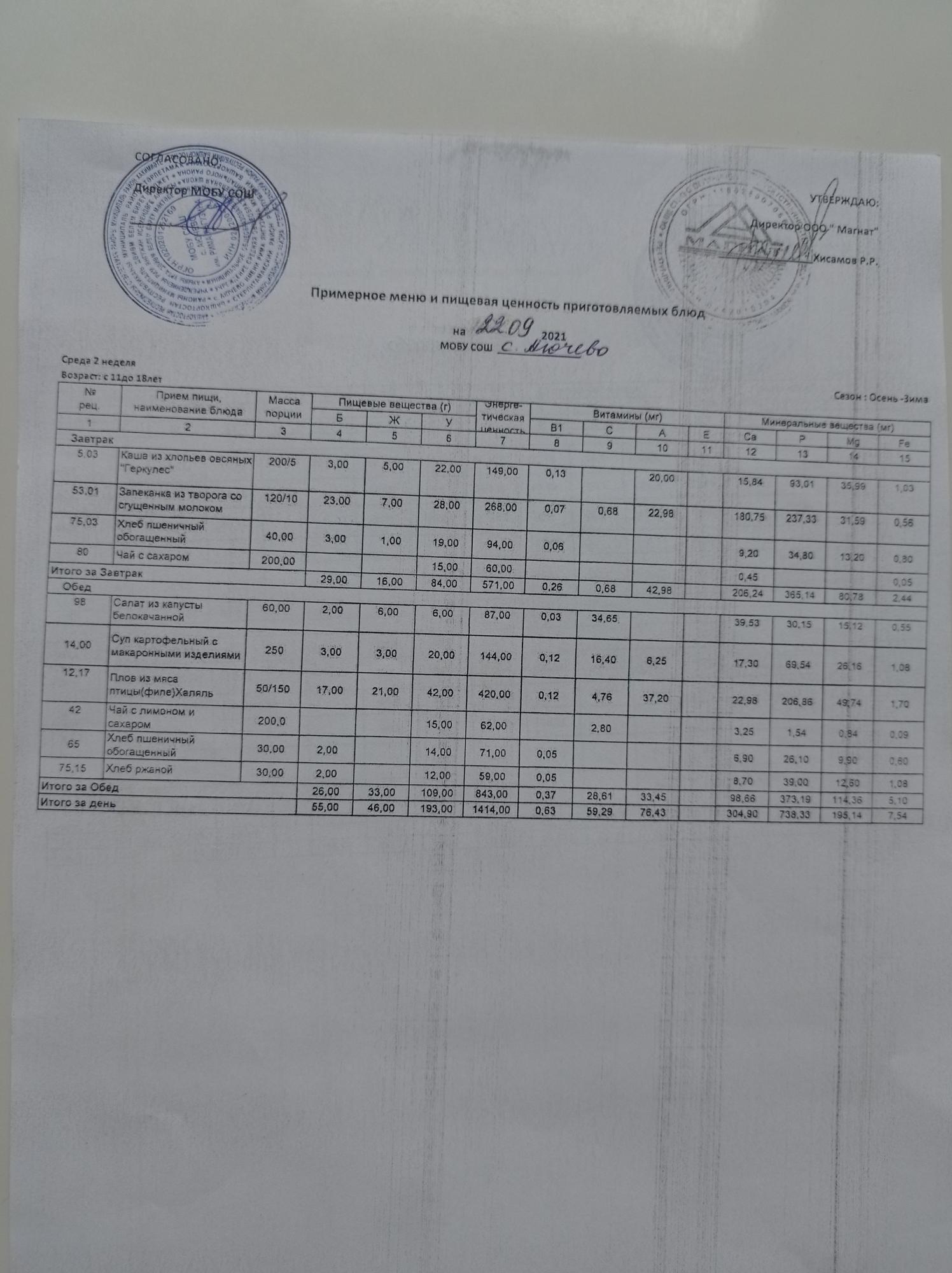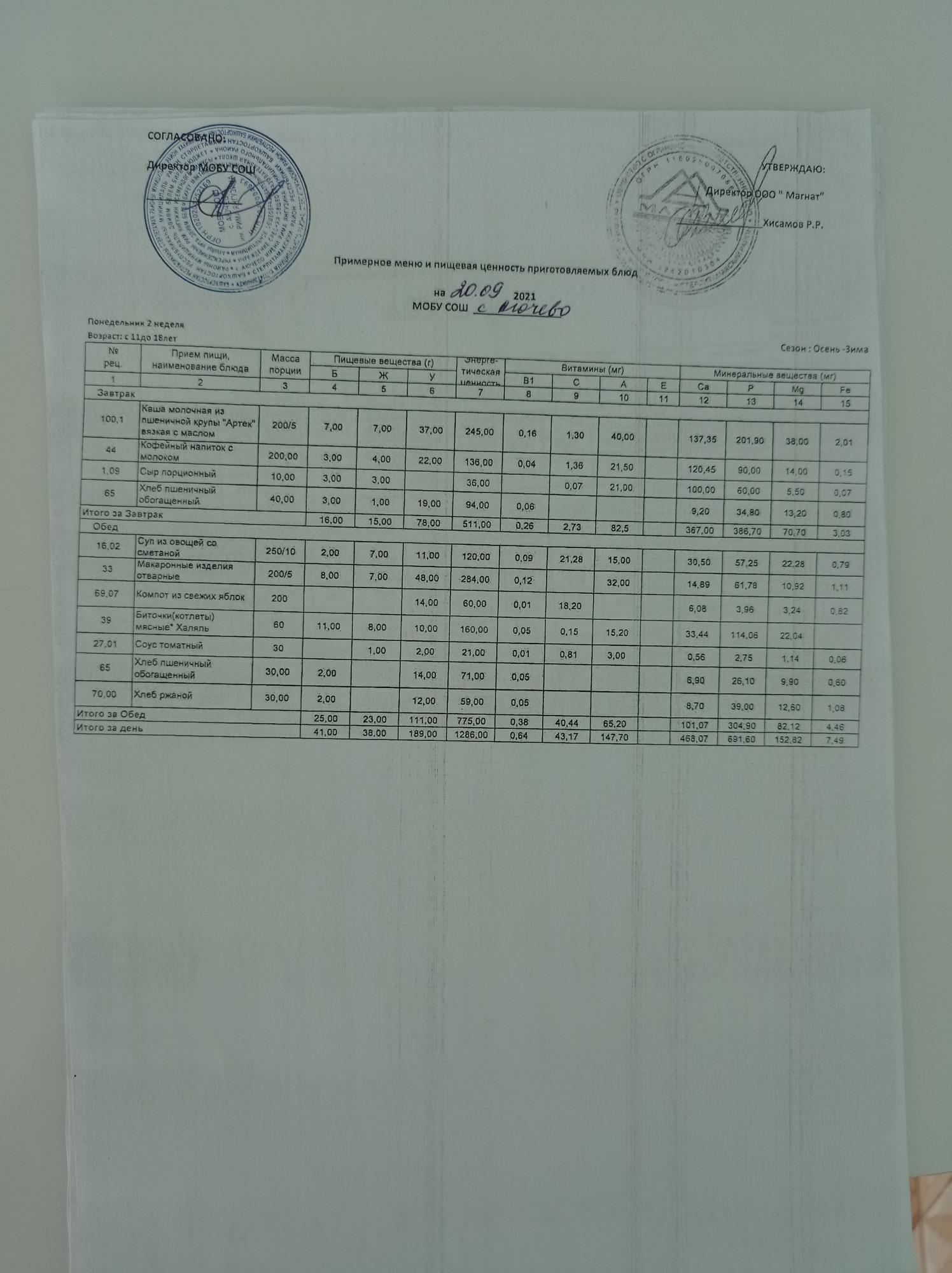 Ежедневное меню дошкольной группы